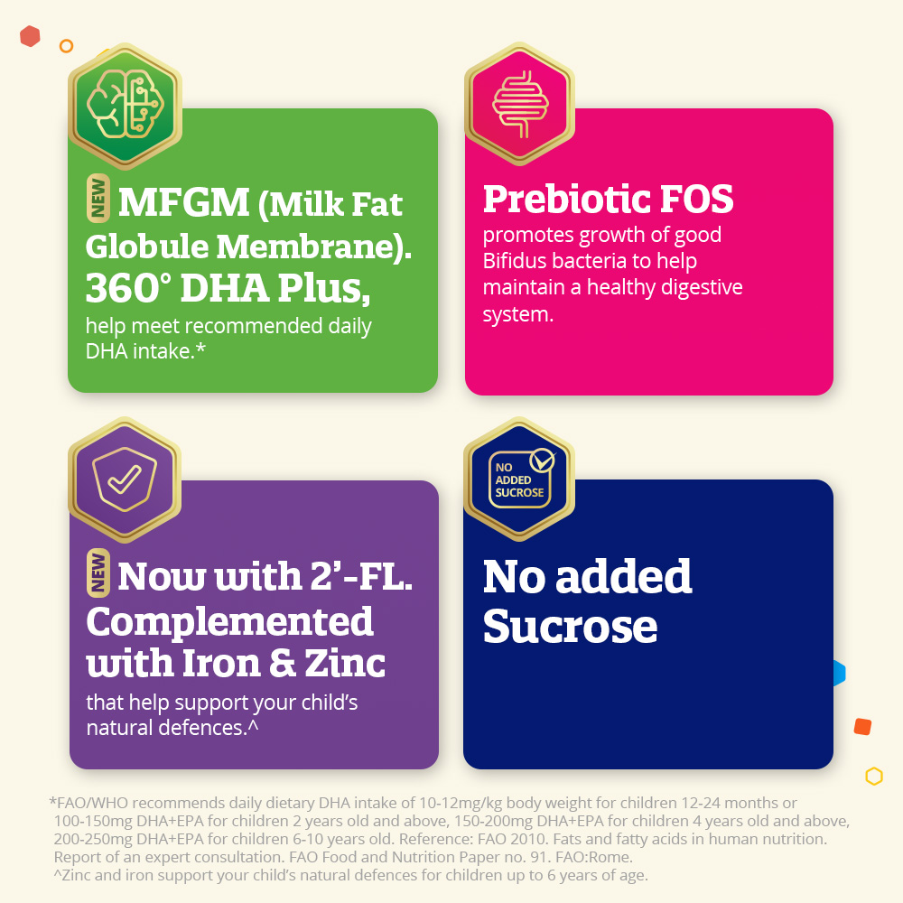 • Milk Fat Globule Membrane (MFGM) is a natural source of phospholipids and spingomyelin, derived from whey protein Formulated with 360’ DHA Plus to help meet recommended daily DHA intake*.