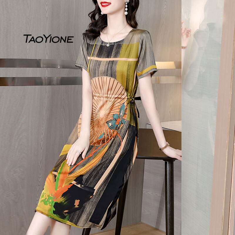 Summer Vintage Print Silk Dress Women Short Sleeve Beach Party Dresses For Women 2023 Korean Midi Sundress Women Casual Vestidos