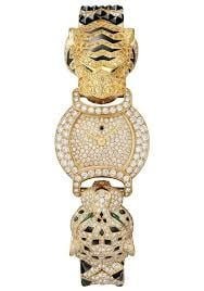 Watches with dials showcasing shagreen-set diamonds, bitten on one side by a panther, and on the other by a tiger, the heads of which are movable.